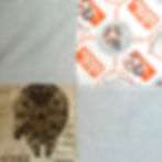 Cut your Star Wars squares using a 6” x 6” quilting ruler and a rotary cutter. You will need 32 Grey blender squares, 12 Resistance squares, 12 Millennium Falcon squares and 8 BB-8 squares.